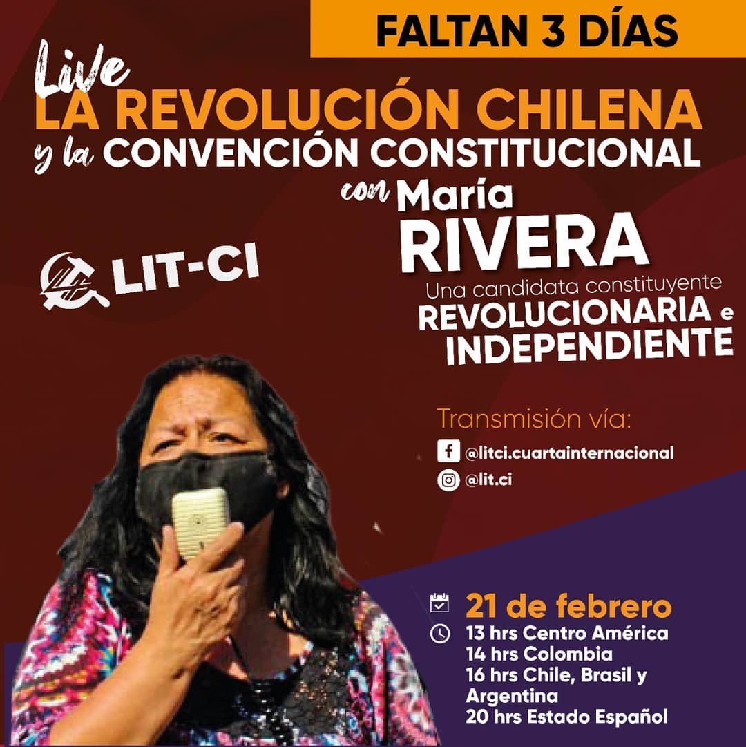 Anche in Italia facciamo appello a tutte le organizzazioni politiche, sindacali e di movimento a esprimere solidarietà, come stanno facendo tutte le organizzazioni cilene, alla compagna Maria Rivera. Domenica 21 febbraio alle ore 20 vi invitiamo a collegarvi alle pagine facebook (@litci.cuartainternacional) e Instagram (@lit.ci) della Lit-Quarta Internazionale per assistere alla presentazione della candidatura di Maria Rivera alla Costituente.